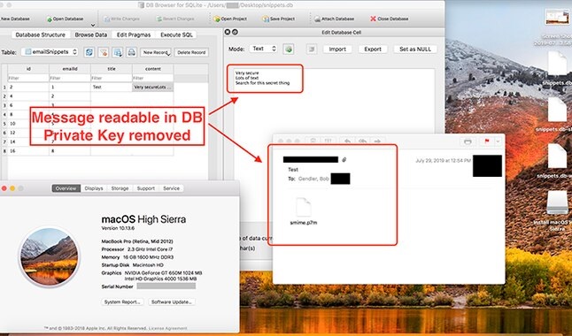 Dentro de ella, descubrió al archivo de base de datos snippets.db, el cual estaba almacenando sin cifrar y de manera totalmente legible parte del texto de los correos electrónicos encriptados de Apple Mail.