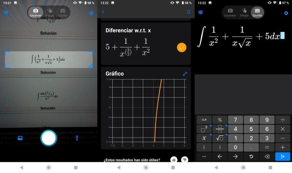 Podés escribir tu consulta (fórmula) usando una calculadora científica en la aplicación, o dibujarla en la pantalla de tu teléfono. Además, podés usar la cámara de tu teléfono y escanear las fórmulas escritas en tu computadora portátil.
