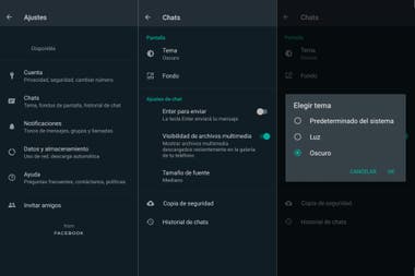 Desde ahí, tendrá que ir a «Chats» y, después, seleccionar «Tema». Hecho esto, podrá escoger entre «Predeterminado por el sistema» (el modo oscuro saltará en las horas de poca luz), Claro (el modo normal) y oscuro.